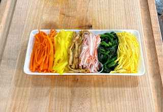 paper. Add a bit of each kimbap ingredient. Fold and roll tightly. Brush with